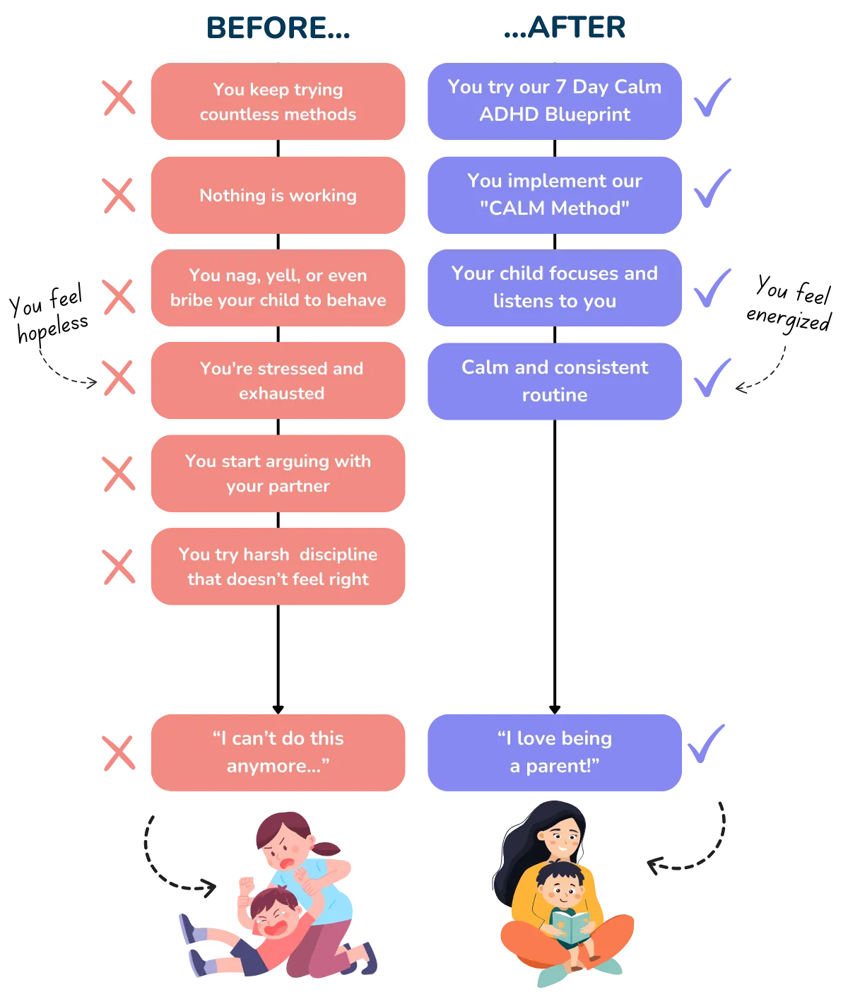 You’ll stop feeling overwhelmed, out of energy, or like a failure as a parent. This is how I felt when I was struggling with my son's ADHD… But in just one week, you'll have the tools to help your child thrive, and you'll feel confident and in control again.